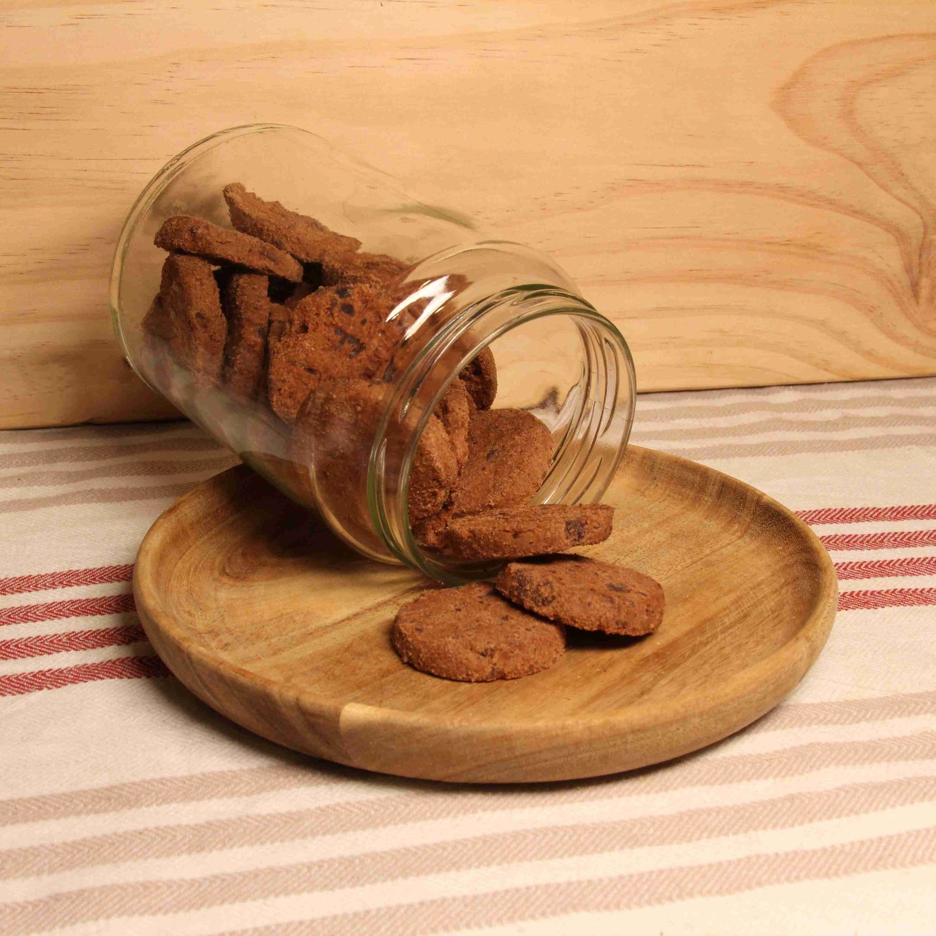 Farine de froment T65*, beurre doux*, sucre de canne non raffiné*, pépites de chocolat noir* (masse de cacao*, sucre de canne*, beurre de cacao*, extrait de vanille*) 24%, oeuf entier en poudre*, poudre de cacao* 1,5%, extrait de vanille*, sel fin de Guérande, poudre à lever : bicarbonate d’ammonium.
