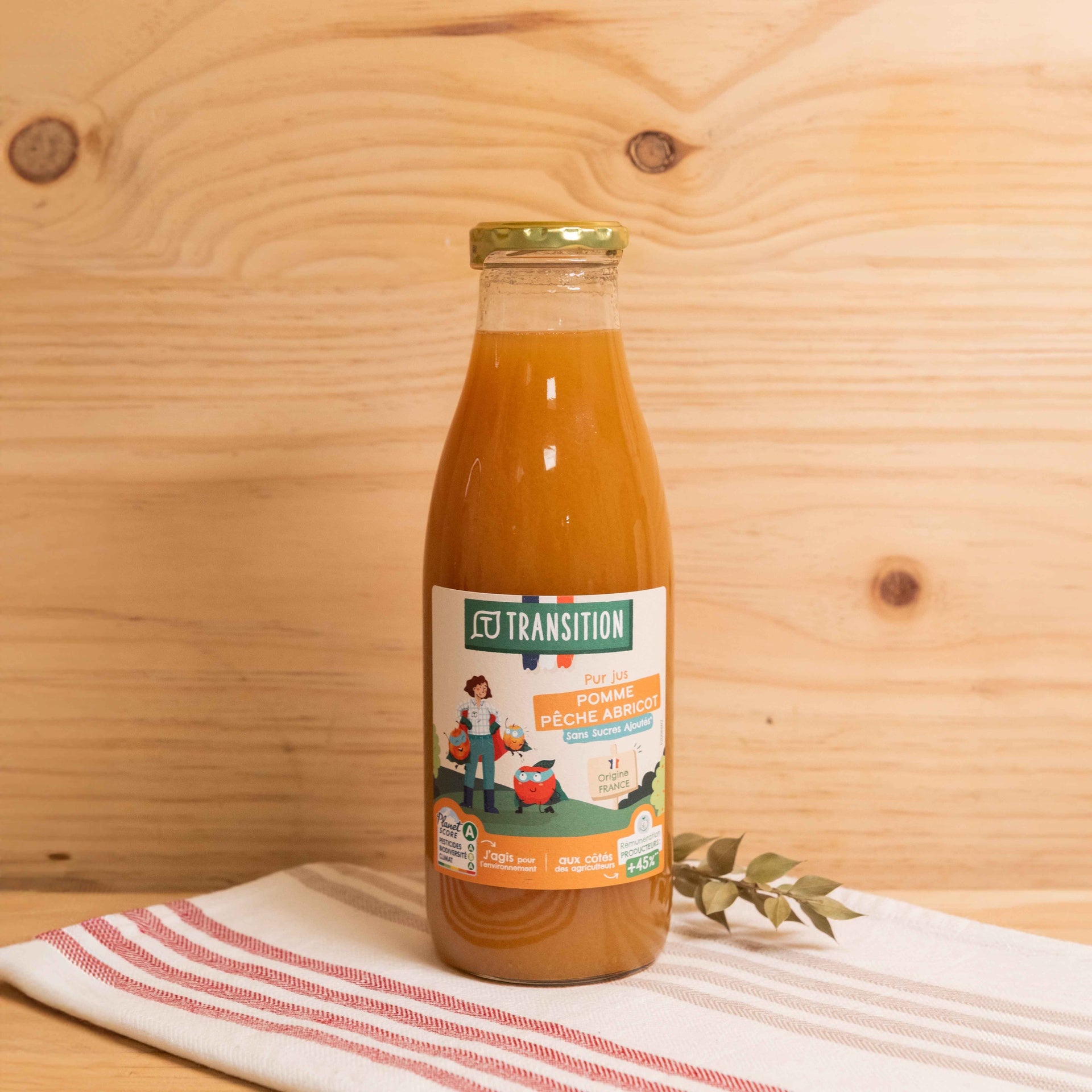 Jus fabriqué en France à partir de pommes, pêches et abricots français en conversion.